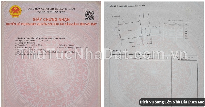 - Khi sử dụng dịch vụ sang tên nhà đất Phường An Lạc của Công Ty Cổ Phần Bất Động Sản Thành Công, khách hàng được tư vấn hồ sơ miễn phí, hỗ trợ kê khai thuế, nộp hồ sơ, theo dõi tiến độ và nhận sổ tận nơi.